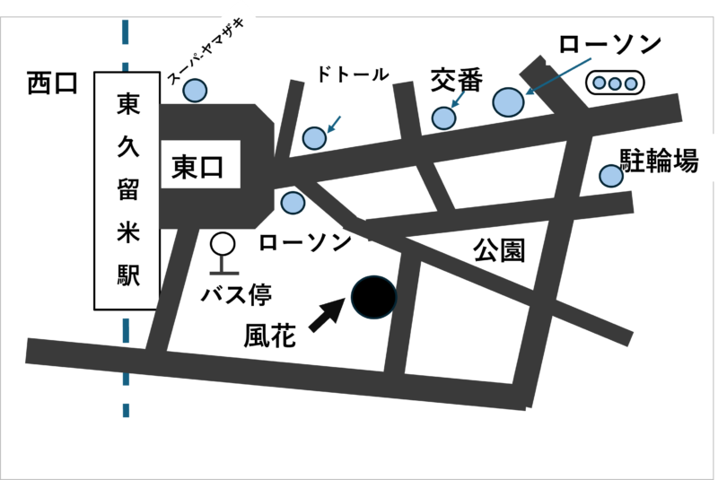 東久留米駅東口、スーパーヤマザキの前を通りドトールコーヒー横の小道を入り道なりに進む。